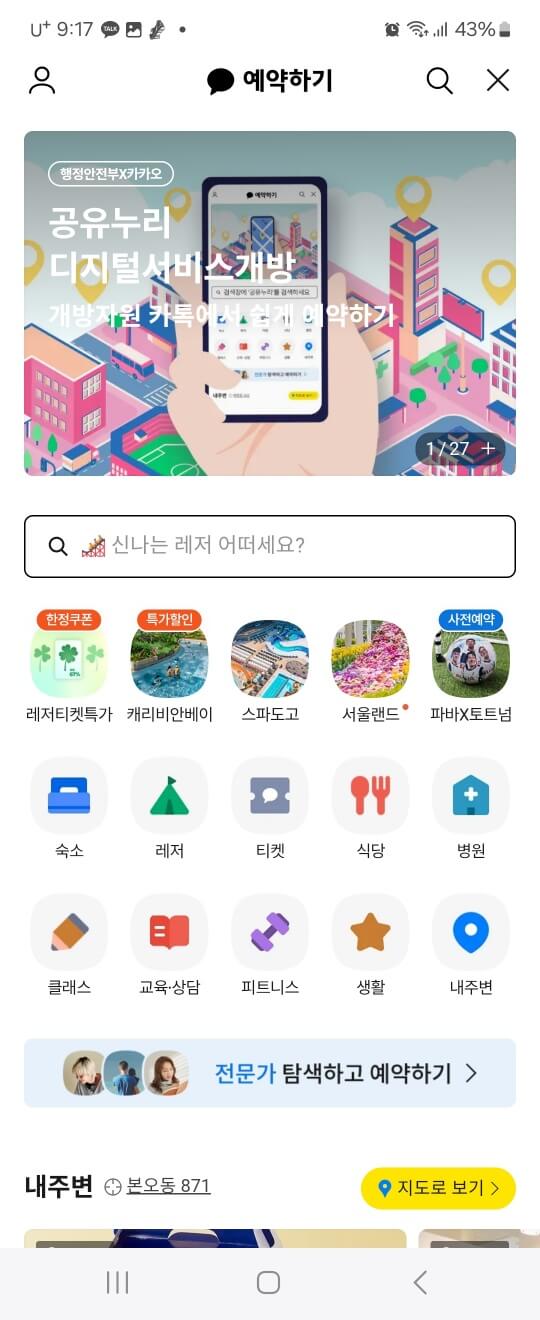 공공시설 예약이 이제 더욱 간편해졌습니다. 행정안전부의 '공유누리' 서비스가 카카오톡 '예약하기' 기능과 연동되어, 테니스장, 회의실, 강의실 등 다양한 공공시설을 손쉽게 예약할 수 있게 되었습니다. 아래 버튼 클릭하셔서 카카오톡을 통해 언제 어디서나 간편하게 예약을 진행해 보세요.