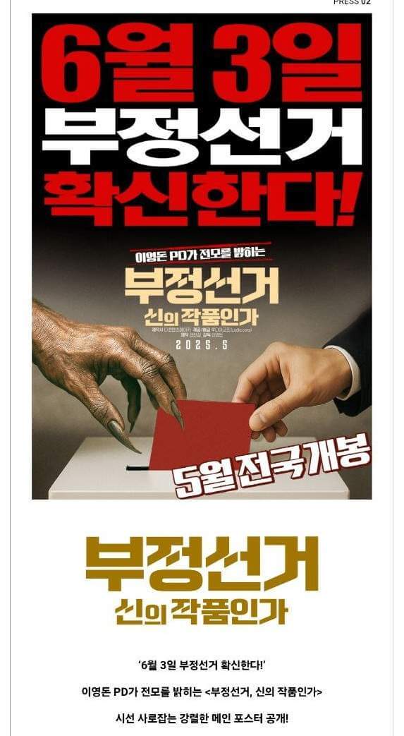 다큐멘터리 영화 '부정선거, 신의 작품인가'는 한국 선거 시스템에 대한 의혹을 제기하며 사회적 논란을 불러일으킨 작품입니다. 더구나 윤석열 전 대통령의 탄핵으로 인해 6월 3일 조기 대선이 치러지는 가운데 개봉한 영화여서 더욱 사회적 반향을 불러일으키고 있습니다.